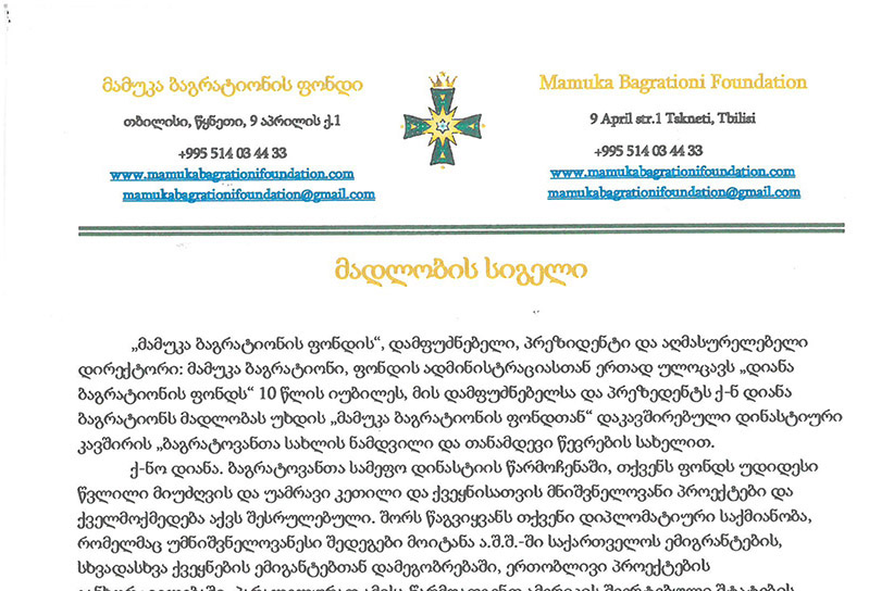 2024 წლის 15 მაისს, შატო-მუხრანის სამეფო სასახლემ, დინასტიური "მამუკა ბაგრატიონის ფონდის" და "საქართველოს კარატეს გაერთიანებული ეროვნული ფედერაციის" ღონისძიებას უმასპინძლა. ღონისძიება მოიცავდა: ფონდის მუშაობის ხელშეწყობისთვის მადლობის სიგელებით დაჯილდოვებას, ფონდის საპატიო წევრების და ორდენის კავალერობის მინიჭებას.